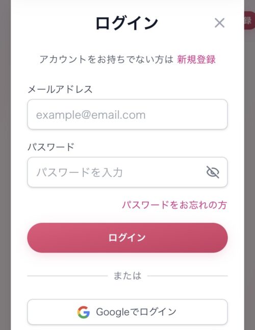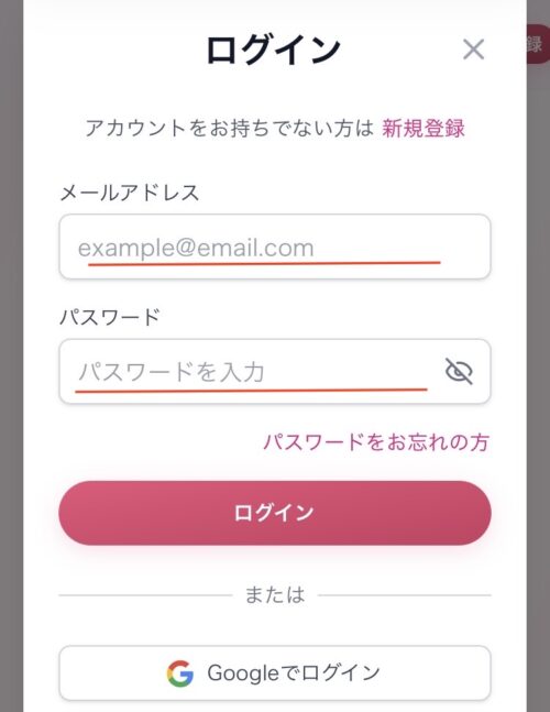 1.メールアドレスと、お好きなパスワードを入力して「ログイン」ボタンを押してください。