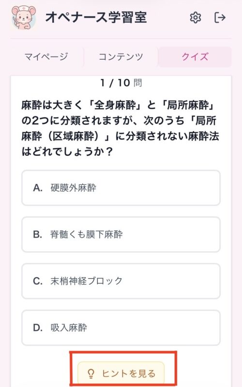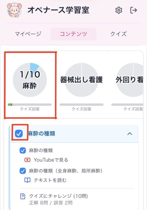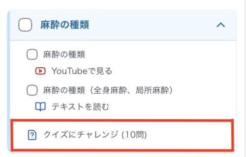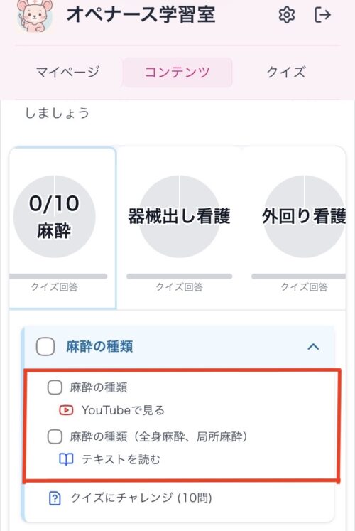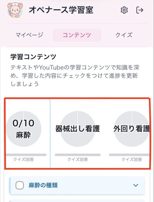 画面のメニューから、いま勉強したいカテゴリ(麻酔、器械出し看護、外回り看護)を選びます。
