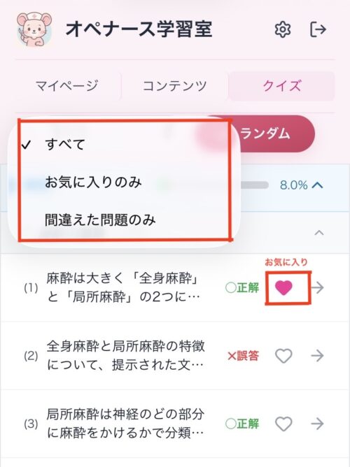 - プラウダウンから「すべて」「お気に入りのみ」「間違えた問題のみ」でクイズを選ぶことができます。