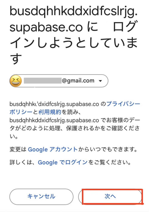- Googleのログイン確認画面が表示されます。確認して「次へ」を選びます。