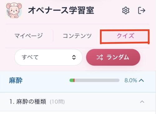 - ランダムを選ぶとランダムにクイズを回答することができます。
